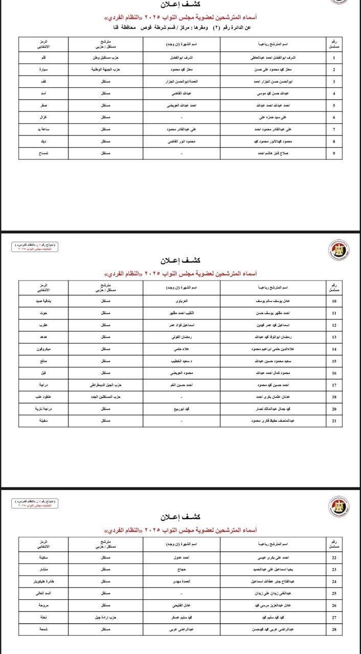 أعلنت الهيئة الوطنية للانتخابات عن الكشوف المبدئية لأسماء المرشحين في انتخابات مجلس النواب 2025 على النظام الفردي بمحافظة قنا.