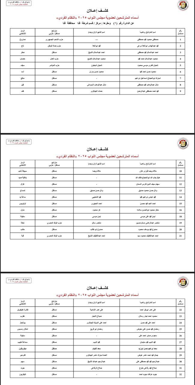 وسيتنافس في محافظة قنا 124 مرشح للفوز بـ9 مقاعد في 4 دوائر انتخابية، بحسب الكشوف المبدئية، وتقسيم الدوائر لانتخابات 2025.