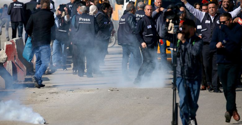 وذكرت النقابة، في بيان لها، أن عشرات الصحفيين المشاركين في تظاهرة عند حاجز قلنديا العسكري أصيبوا بحالات اختناق جراء قمعهم من الجيش الإسرائيلي.