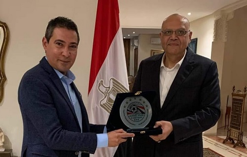 أهدى محمد بركات عضو مجلس إدارة اتحاد الكرة ورئيس بعثة المنتخب الأوليمبي بالمغرب، درع اتحاد الكرة وقميص المنتخب إلى السيد ياسر عثمان سفير مصر فى المغرب .