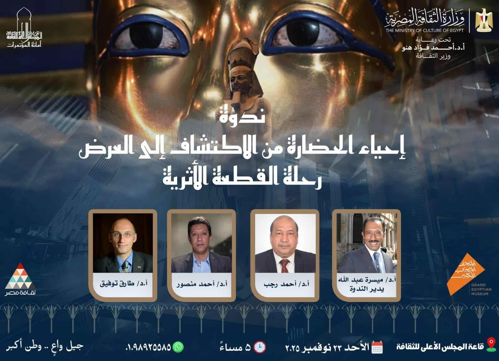 وتأتي الندوة ضمن جهود وزارة الثقافة والمجلس الأعلى للثقافة في دعم الوعي الحضاري وتعريف الجمهور بأهم مراحل العمل الأثري وأسراره، وضمن الاحتفالات الوطنية بافتتاح واحد من أكبر وأهم المتاحف على مستوى العالم.