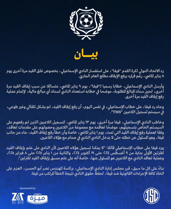 بناءً على كل ما سبق، قرر مجلس إدارة النادي الإسماعيلي، برئاسة نصر أبو الحسن، العزم على اتخاذ كافة الإجراءات القانونية ضد فيفا، لحفظ حقوق النادي نتيجة الخطأ المرتكب من فيفا.