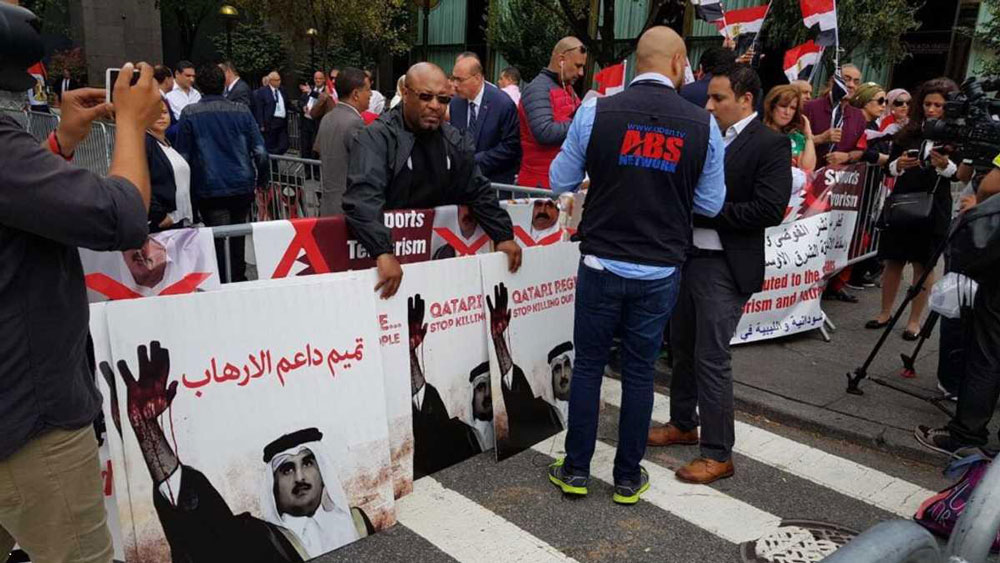 وردد المتظاهرون عبارات الشجب والاستنكار ضد حضور أمير قطر فعاليات المؤتمر، مطالبين بضرورة التصدي لإرهاب قطر ووقف تمويلها ودعمها للإرهاب.