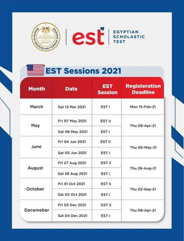 أعلنت وزارة التربية والتعليم جدول الامتحان المصري EST هو المؤهل الوحيد لطلاب الدبلومة الأمريكية لتنسيق الجامعات المصرية مع فترة سماح لمدة ٦ شهور لطلاب Grades 11, 12 من ١٥ فبراير ٢٠٢١ حتى ١٥ اغسطس ٢٠٢١ (وليس بأثر رجعي).
