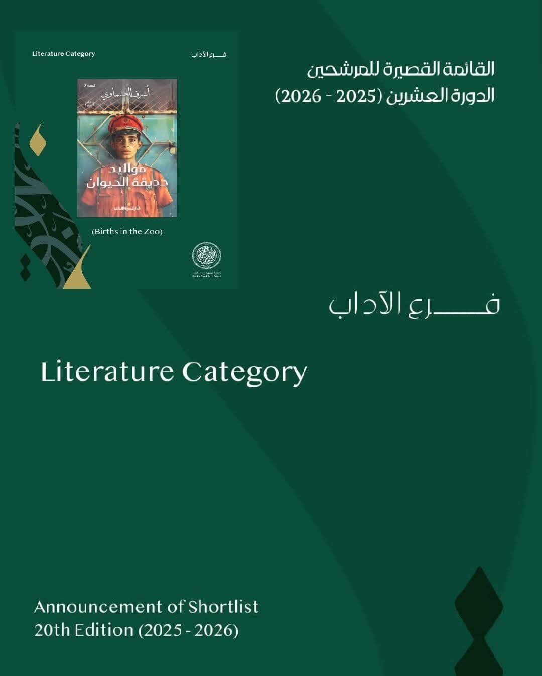 أعرب الكاتب أشرف العشماوي عن سعادته بوصول كتابه الذي يضم ثلاث روايات قصيرة بعنوان مواليد حديقة الحيوان، والصادرة عن الدار المصرية اللبنانية، إلى القائمة القصيرة لـ جائزة الشيخ زايد للكتاب – فرع الآداب، وذلك عبر حسابه الرسمي على موقع «فيسبوك».