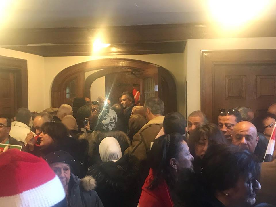 وقام الناخبون بالالتفاف حول السفير المصرى، وسط الأغانى والأناشيد الوطنية، والذى قام ومن خلفه أعداد ضخمة من الناخبين بترديد النشيد الوطنى فى مشهد رائع.