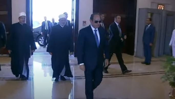كان في استقبال الرئيس السيسي فور وصوله فضيلة الإمام الأكبر الدكتور أحمد الطيب شيخ الأزهر الشريف، ووزير الأوقاف الدكتور محمد مختار جمعة.