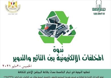 تنظم لجنة الجغرافيا والبيئة ومقررها الدكتور السيد الحسيني، ندوة بعنوان "المخلفات الإلكترونية بين التأثير والتدوير"، وذلك في تمام الخامسة من مساء الخميس الموافق 20 مايو الحالي، بقاعة المجلس الأعلى للثقافة في ساحة دار الأوبرا المصرية.