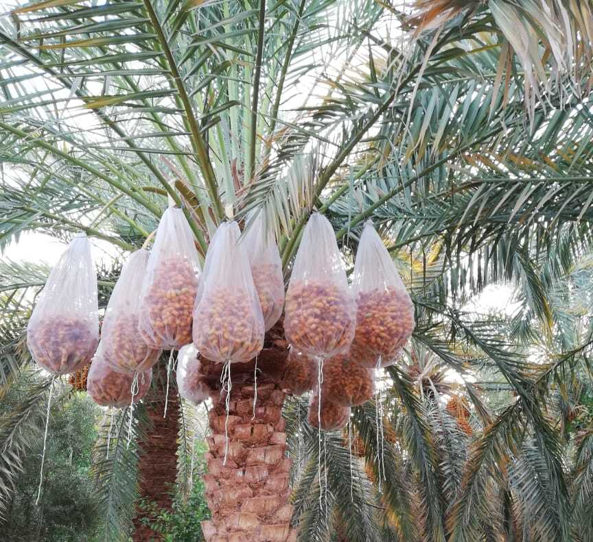 ويتم وضع عراجين البلح فى شكاير بلاستيكية ذات ثقوب مخصصة لعملية التكييس لضمان الحفاظ على الثمار حتى مرحلة الجني.