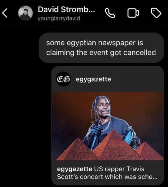علق ديفيد سترومبرج مدير أعمال مغني الراب العالمي ترافيس سكوت على الأنباء المتداولة عن إلغاء حفله في الأهرامات قائلا إنها "مفبركة".