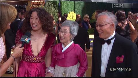 حضرت الممثلة ساندرا أوه بطلة مسلسل Killing eve إلى حفل توزيع جوائز إيمي 2018 بصحبة والديها.