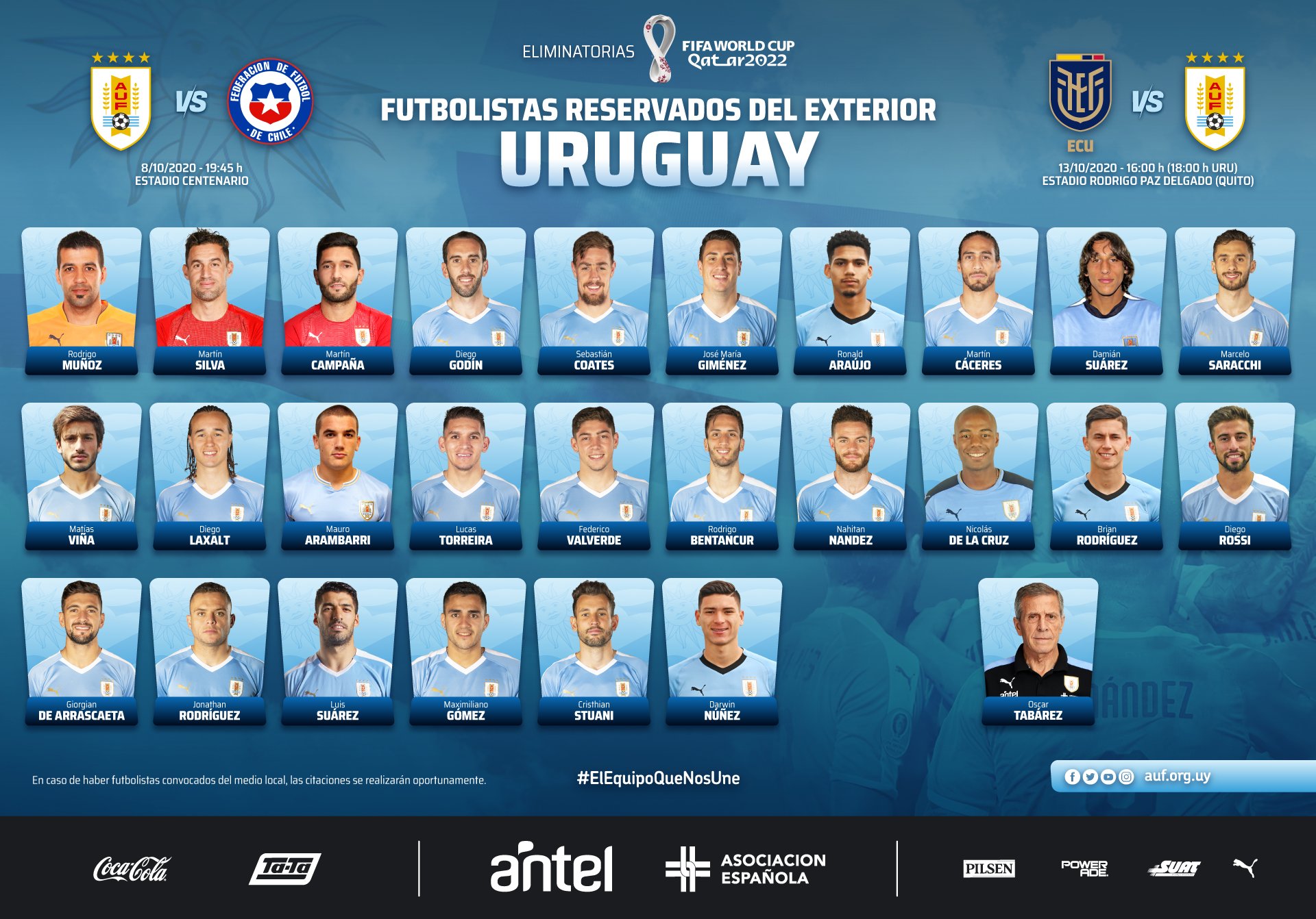 أعلن أوسكار تباريز المدير الفني لمنتخب أوروجواي عن قائمة فريقه للمشاركة في تصفيات كأس العالم قطر 2022.