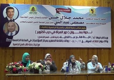 وخلال الندوة، قامت المحاضرة بسرد تاريخي لدور المرأة المصرية منذ بداية القرن التاسع عشر مرورا بثورة 19 وما تلاها من انتفاضات وصولا لدورها الكبير في نصر أكتوبر العظيم، موضحةً بعض الأمثلة للنساء الرائدات خلال هذه الفترة ودورهم الريادي في هذا الحدث الكبير، مؤكدة بأن المرأة هي صانعة البطولات، وتحملت أعباء الأسرة المصرية حتى عاد زوجها بالنصر.