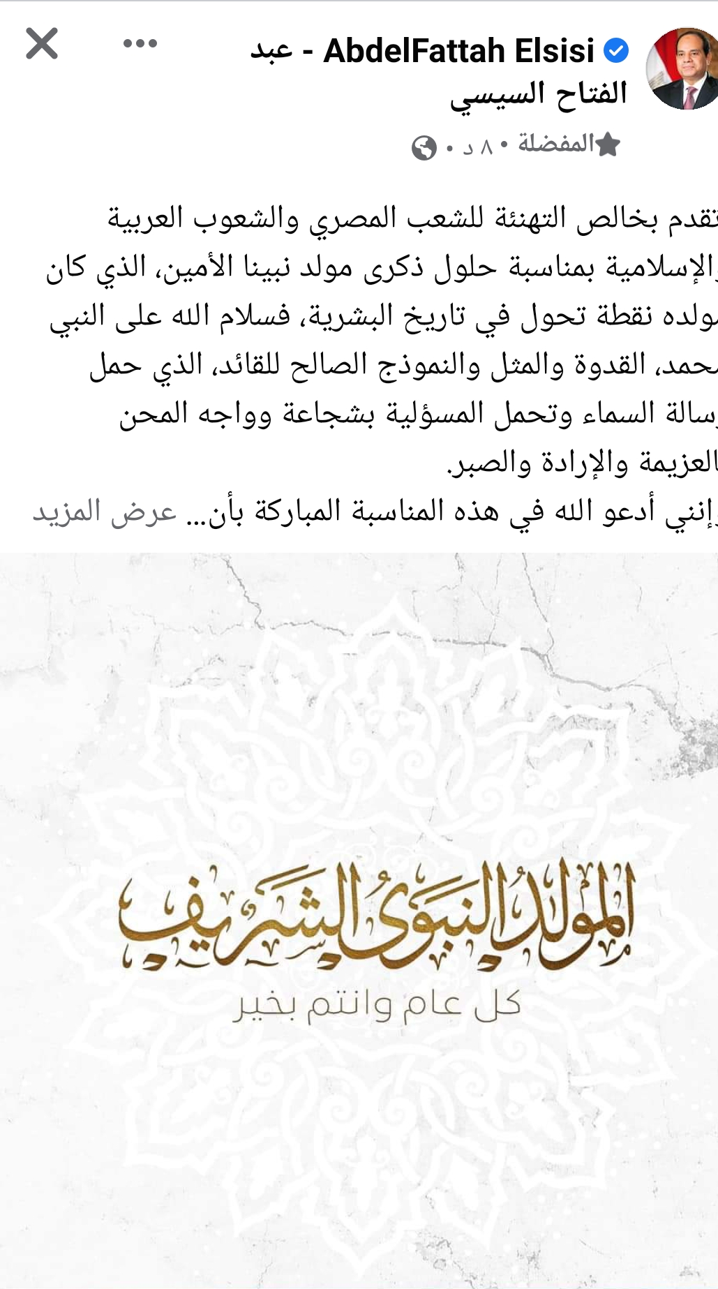 قدم الرئيس عبد الفتاح السيسي، خالص التهنئة للشعب المصري والشعوب العربية والإسلامية بمناسبة حلول ذكرى مولد نبينا الأمين، قائلا: "كان مولده نقطة تحول في تاريخ البشرية، فسلام الله على النبي محمد، القدوة والمثل والنموذج الصالح للقائد، الذي حمل رسالة السماء وتحمل المسؤلية بشجاعة وواجه المحن بالعزيمة والإرادة والصبر".