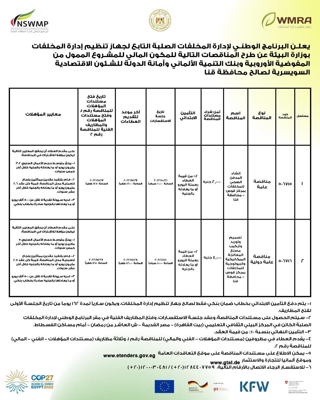 أعلن البرنامج الوطني لإدارة المخلفات الصلبة التابع لجهاز تنظيم إدارة المخلفات بوزارة البيئة، عن طرح مناقصتين بشأن إنشاء وتوريد مصنع معالجة المخلفات ومدفن صحي في مدينة قوص بمحافظة قنا، بالتعاون مع الهيئة العامة للخدمات الحكومية، وذلك فى إطار توجيهات الدكتورة ياسمين فؤاد وزيرة البيئة ووفقا لخطة عمل البرنامج الوطني بالمحافظات الأربعة الواقعة في نطاق عمل البرنامج (قنا/ اسيوط/الغربية / كفرالشيخ).