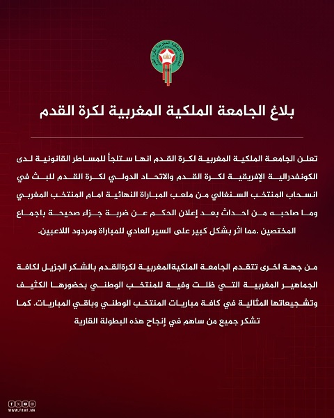 أعلنت الجامعة الملكية المغربية لكرة القدم، في بلاغ رسمي، عزمها سلك الطرق القانونية لدى كل من الاتحاد الدولي لكرة القدم «فيفا» والاتحاد الأفريقي لكرة القدم «كاف»، من أجل البت في الأحداث التي رافقت نهائي كأس أمم أفريقيا بين المغرب والسنغال.