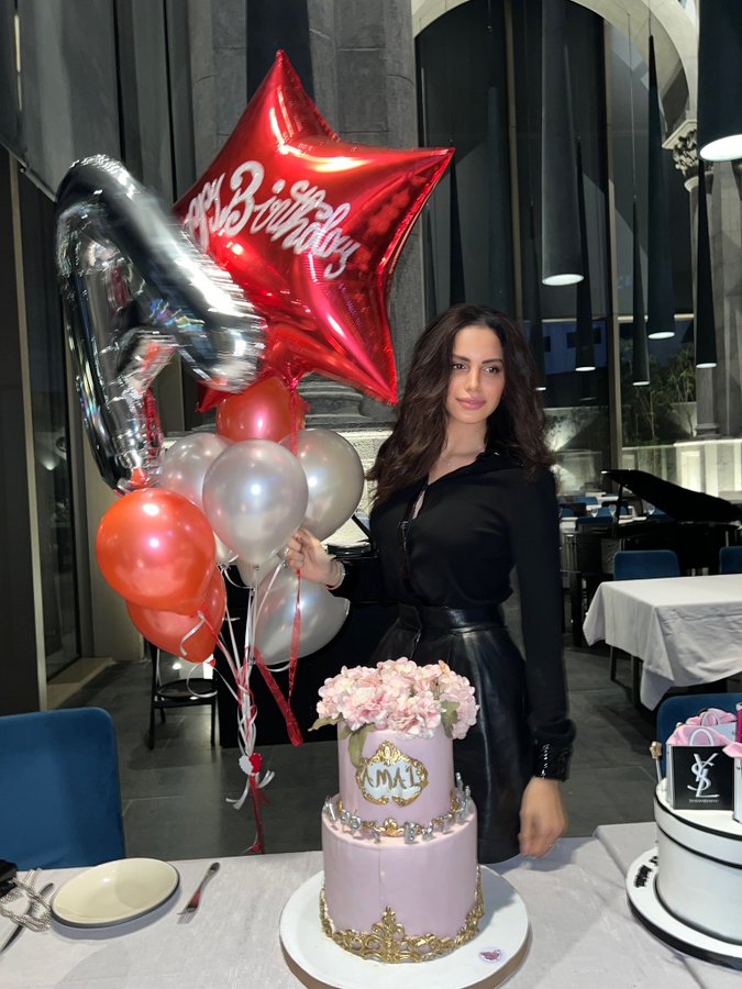 وظهرت بإطلالة مميزة مرتدية ملابس سوداء اللون، وممسكة بعدد من البالونات، وتقف أمام تورتة وردية اللون.