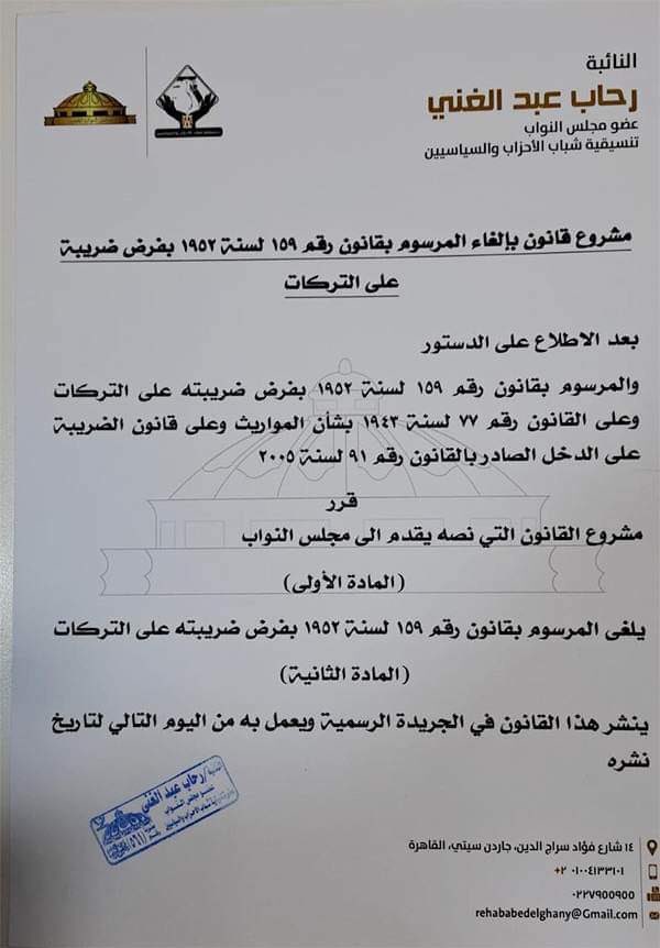 أعلنت اليوم النائبة رحاب عبد الغني، عضو مجلس النواب عن تنسيقية شباب الأحزاب والسياسيين، عن تقدمها بمشروع لإلغاء الرسوم بالقانون رقم 159 لسنة 1952 بفرض ضريبة على التركات.
