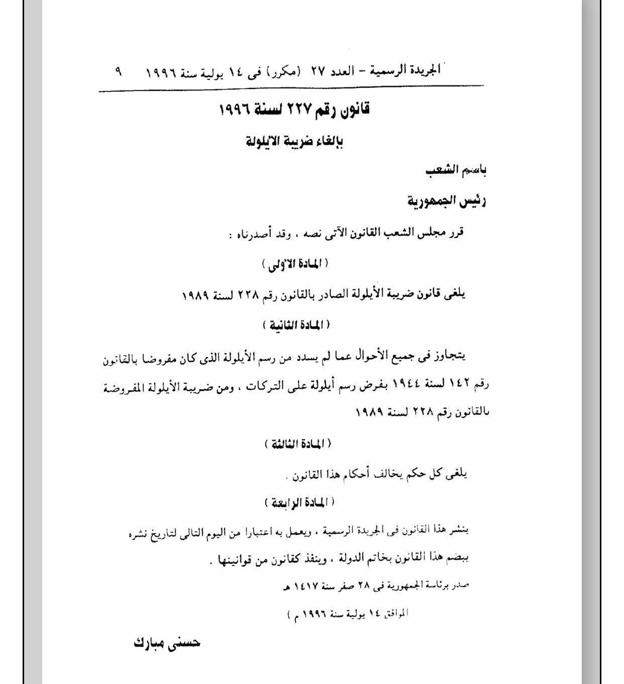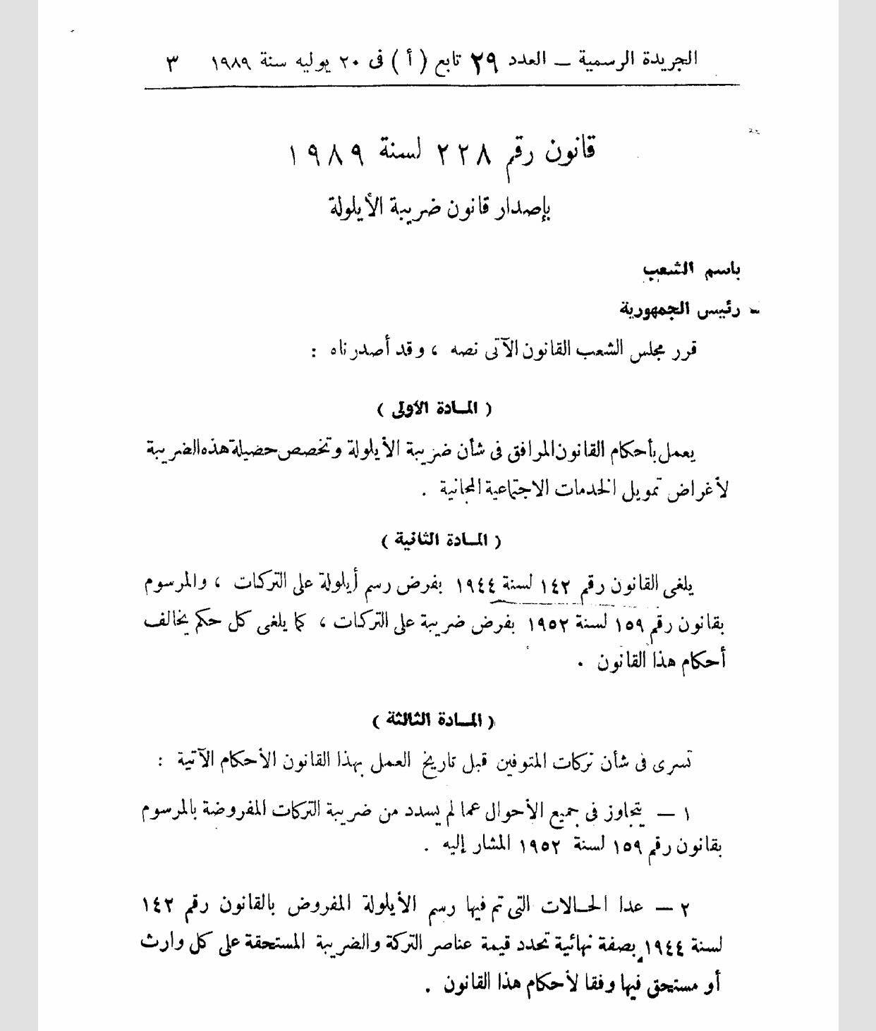 وأصدر الرئيس حسني مبارك قانونا برقم 228 لسنة 1989 بإلغاء رسوم الأيلولة على التركات وإلغاء ضريبة التركات التي تقررت بعد ثورة يوليو.