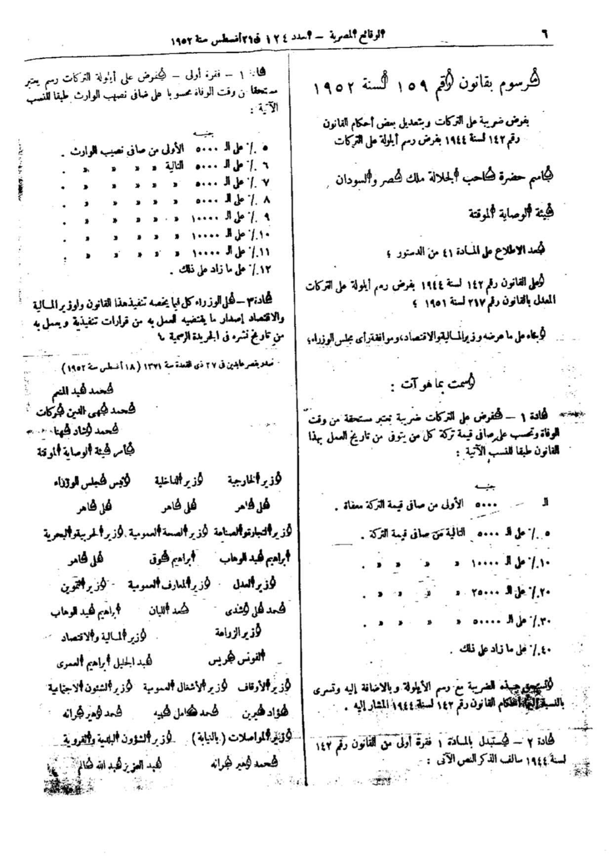 وكان هذا المرسوم الذي حمل رقم 159 لسنة 1952 يهدف إلى زيادة عوائد الدولة المالية في فترة انتقالية صعبة سياسيا واقتصاديا.