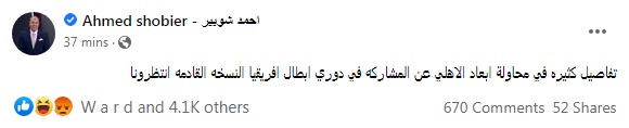 وكتب شوبير من خلال حسابه الرسمي على موقع التواصل الاجتماعي فيسبوك:" تفاصيل كثيرة في محاولة ابعاد الأهلي عن المشاركه في دوري أبطال إفريقيا النسخة القادمة انتظرونا".