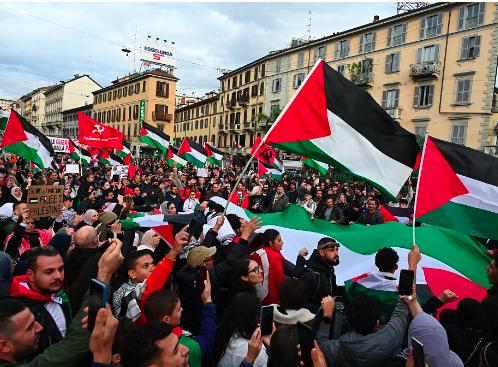 نظم مؤيدون لفلسطين في إيطاليا، مظاهرة أمام وزارة الخارجية بالعاصمة روما تحت شعار "أوقفوا الإبادة الجماعية"، مطالبين حكومتهم بإنهاء اتفاقياتها مع إسرائيل.