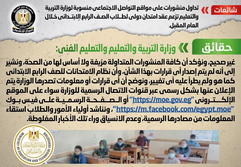 وأضافت أنه لم يتم إصدار أية قرارات بهذا الشأن، وأن نظام الامتحانات للصف الرابع الابتدائي كما هو ولم يطرأ عليه أي تغيير، مُوضحةً أن أي قرارات أو معلومات تصدرها الوزارة يتم الإعلان عنها بشكل رسمي عبر قنوات الاتصال الرسمية للوزارة سواء على الموقع الإلكتروني "https://moe.gov.eg" أو الصفحة الرسمية على فيسبوك "https://m.facebook.com/egypt.moe"، مُناشدةً أولياء الأمور والطلاب استقاء المعلومات من مصادرها الرسمية، وعدم الانسياق وراء تلك الأخبار المغلوطة.