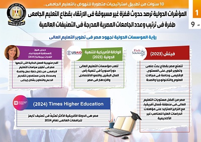 وفي هذا الصدد نشر المركز الإعلامي لمجلس الوزراء تقريراً تضمن إنفوجرافات تسلط الضوء على المؤشرات الدولية التي رصدت حدوث قفزة غير مسبوقة في الارتقاء بقطاع التعليم الجامعي، والطفرة في ترتيب وعدد الجامعات المصرية المدرجة في التصنيفات العالمية، وذلك عقب 10 سنوات من تطبيق استراتيجيات متطورة للنهوض بالتعليم الجامعي.