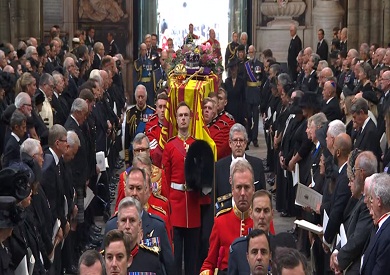 ويقود الملك تشارلز الثالث موكبًا خلف نعش والدته في رحلة قصيرة من قاعة وستمنستر المسجى فيها الجثمان طيلة الأيام الأربعة الماضية إلى دير وستمنستر في وقت لاحق اليوم.