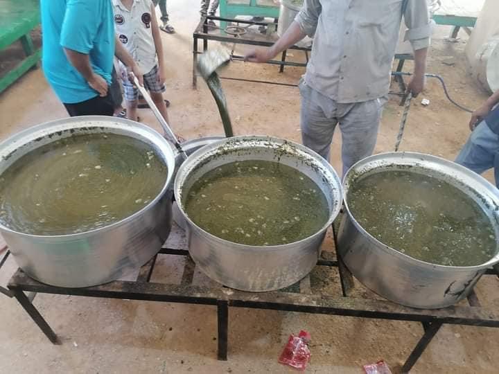 وأوضح محمود جلال، أحد القائمين على مأدبة الملوخية، أنه يتم تجهيزها على يد مجموعة من شباب القرية محترفون في الطبخ؛ حيث يتم في البداية ذبح عجل كبير ثم تُطبخ عليه الملوخية، فضلًا عن باقي مكونات الوجبة، وهي كميات من الأرز، وأخرى من الكمونية وهي عبارة عن خليط من الصلصة ممتزج ببعض اللحوم البيضاء من العجل.