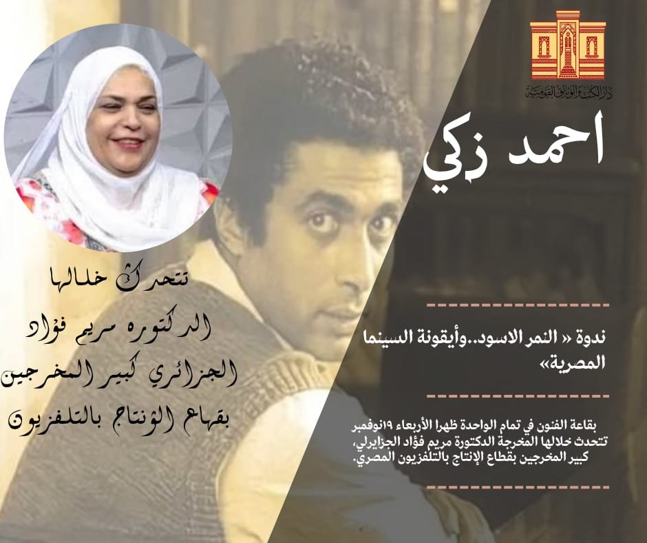 أقامت خدمات القراء بالإدارة المركزية لدار الكتب برئاسة الدكتور مينا رمزي في الواحدة من ظهر الأربعاء 19 نوفمبر ندوة ثقافية بعنوان "أحمد زكي… النمر الأسود وأيقونة السينما المصرية"، وذلك في قاعة الفنون التابعة لخدمات القراء.