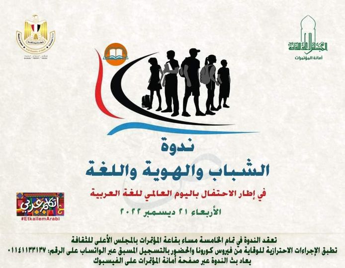 يعقد المجلس الأعلى للثقافة، ندوة بعنوان: "الشباب والهوية واللغة"، تنظمها لجنة الشباب بالتعاون مع لجنة الشعر ولجنة الدراسات الأدبية والنقدية واللغوية، وذلك في الخامسة مساء بعد غد الأربعاء، بقاعة المؤتمرات بالمجلس الأعلى للثقافة.
