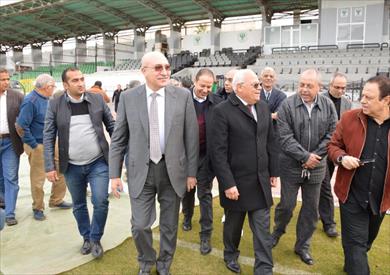 رافق المحافظ في الزيارة المهندس كامل أبو زهرة السكرتير العام للمحافظة، والدكتور علي أبو سمرة وكيل وزارة الشباب والرياضة، وكان في استقباله سمير حلبية رئيس مجلس إدارة النادي المصري وأعضاء مجلس الإدارة، وتفقد المحافظ صالة الاستقبال لكبار الضيوف وغرفة التحكم لتشغيل كاميرات المراقبة وكذلك مدرجات وأرضية الملعب.