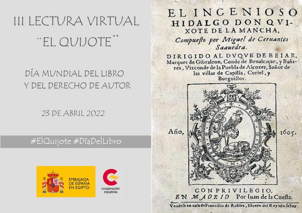 وتنظم السفارة الإسبانية في مصر، القراءة، افتراضيا، منذ عام 2020؛ بسبب جائحة كورونا، باللغتين الإسبانية والعربية؛ وذلك بهدف تعزيز الروابط وتقريب المسافات في أوقات العزلة، التي خلفتها إجراءات الحجر الصحي والحظر، وهي مبادرة تعكس أهمية دور الثقافة في توحيد الشعوب وخلق روابط وجسور بين بعضها.