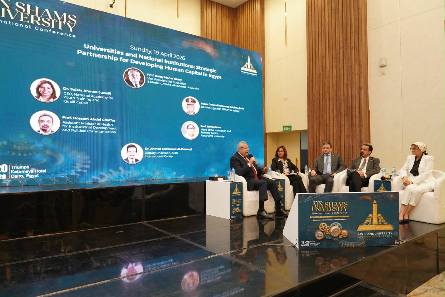 شهدت فعاليات اليوم الأول للمؤتمر العلمي الدولي الرابع عشر لجامعة عين شمس، المنعقد تحت عنوان «الجامعات قاطرات للتنمية الوطنية نحو الابتكار والنمو الاقتصادي المستدام »، عقد جلسة حوارية بعنوان «الجامعات والمؤسسات الوطنية: شراكة استراتيجية لبناء الإنسان المصري»، وذلك بمشاركة نخبة من القيادات والخبراء من مؤسسات الدولة والقطاعين العام والخاص.