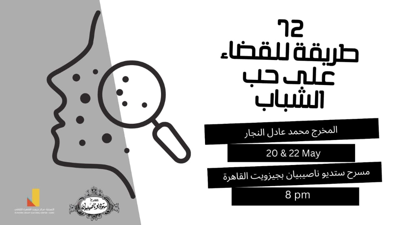 يستضيف مسرح استوديو ناصبيان بجزويت القاهرة، العرض المسرحي "72 طريقة للقضاء على حب الشباب"، من تأليف وإخراج محمد عادل النجار.