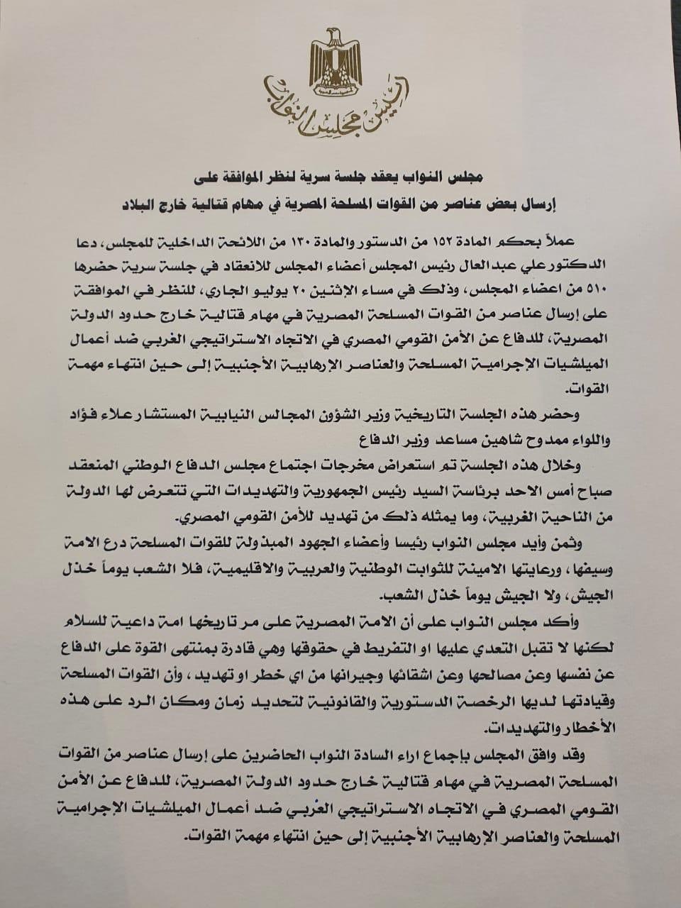 وورد في بيان رسمي عن البرلمان، أنه عملاً بحكم المادة 152 من الدستور والمادة 130 من اللائحة الداخلية للمجلس، دعا الدكتور علي عبدالعال رئيس المجلس أعضاء المجلس للانعقاد في جلسة سرية حضرها 510 من اعضاء المجلس، وذلك في مساء الإثنين 20 يوليو الجاري، للنظر في الموافقة على إرسال عناصر من القوات المسلحة المصرية في مهام قتالية خارج حدود الدولة المصرية، للدفاع عن الأمن القومي المصري في الاتجاه الاستراتيجي العربي ضد أعمال الميلشيات الإجرامية المسلحة والعناصر الإرهابية الأجنبية إلى حين انتهاء مهمة القوات.