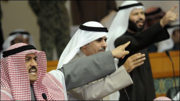 مسلم البراك الأول ناحية اليسار خلال انتقاده وجود قوات الشرطة حول البرلمان الكويتي