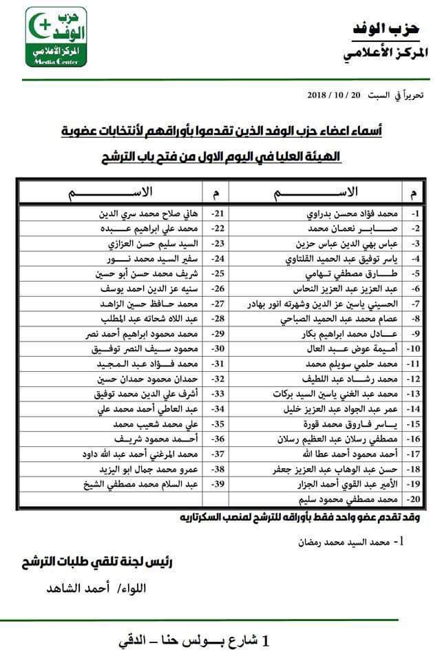 وبلغ عدد المتقدمين لطلبات الترشح حتى ظهر اليوم 21 شخصا؛ أبرزهم من رموز الحزب، فؤاد بدراوي، وهاني سري الدين، وإضافة إلى صابر نعمان ، وعباس حزين، ومصطفى رسلان، وعصام الصباحى.