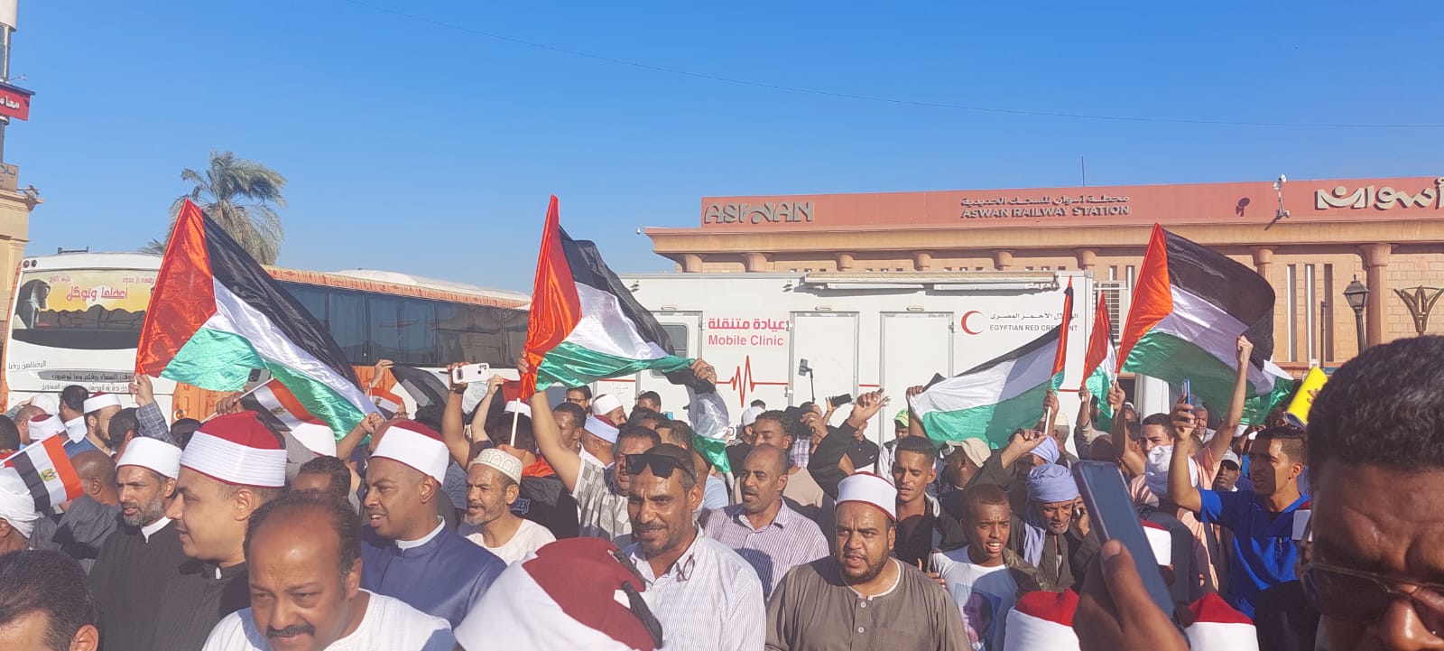 وتوافد المئات من أبناء المراكز على مستوى محافظة أسوان، صباح اليوم الجمعة، بمواصلات الطريق الصحراوي والزراعي للمشاركة في تجمهر المواطنين لدعم القضية الفلسطينية بميدان المحطة.
