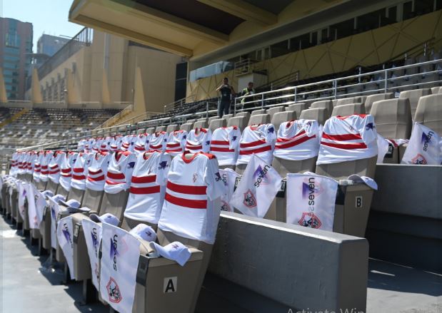 مدرجات ستاد (آل نهيان) تزين بقميص الزمالك في انتظار دخول جماهير الفريقين لملعب المباراة.