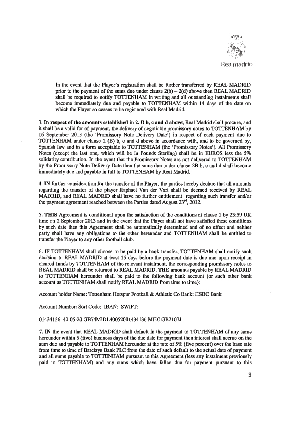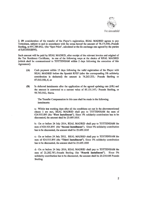 وذكرت الصحيفة أن ريال مدريد دفع المبلغ للنادى اللندنى على أربع دفعات ، حيث كانت الدفعة الأولى بعد 10 ايام من انضمامه إلى الفريق الملكى ، اما الثانية والثالثة قبل 24 يوليو 2014 و2015 ، فيما ستكون الدفعة الرابعة فى يوليو المقبل .