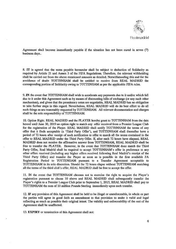 كما كشفت الصحيفة أن توتنهام وضع بنداً فى العقد يسمح له بأن يكون الخيار الأول فى حال اراد النجم الويلزى العودة إلى الدورى الأنجليزى ، حيث يمكنه شراءه بأى ثمن .