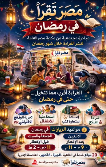 أعلنت مكتبة مصر العامة الرئيسية بالجيزة، إطلاق مبادرة مجتمعية جديدة بعنوان «مصر تقرأ في رمضان»، وذلك من خلال مكتباتها المتنقلة «مصر تقرأ»، في إطار برنامج الخدمات الخارجية الهادف إلى نشر ثقافة القراءة وإتاحة المعرفة خارج أسوار المكتبة، خاصة خلال شهر رمضان المبارك.