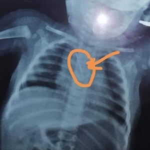 وكان مستشفى بنها الجامعي استقبل طفلا عمره ٦ شهور وتم تحويله لقسم جراحة القلب والصدر يعاني من كحة مزمنة وأهله لا يعلمون السبب وبعمل أشعة عادية على الصدر تبين أن الطفل ابتلع دبوس طرحة من الحجم الكبير ومستقر بالقصبة الهوائية.