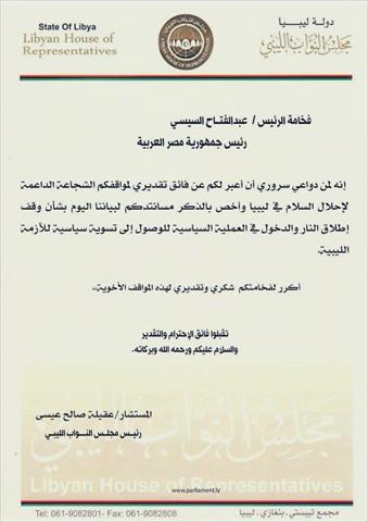 "إنه من دواعى سرورى أن أعبر لكم عن فائق تقديرى لمواقفكم الشجاعة الداعمة لإحلال السلام فى ليبيا، وأخص بالذكر مساندتكم لبياننا اليوم بشأن وقف إطلاق النار والدخول فى العملية السياسية للوصول إلى تسوية سياسية للأزمة الليبية، أكرر لفخامتكم شكرى وتقديرى لهذه المواقف الأخوية".