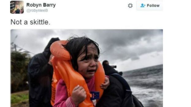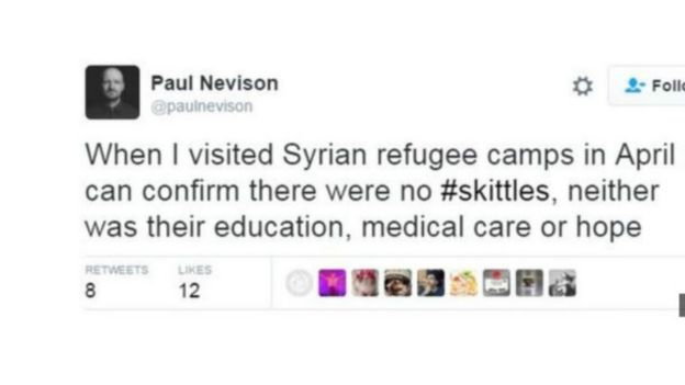 وقال بول نيفيسون في تغريدة أيضا "حينما زرت معسكرات اللاجئين السوريين في أبريل/نيسان، يمكنني أن أؤكد أنه لا يوجد (حلوى) سكيتلز، ولم يوجد أيضا تعليم أو رعاية صحية أو أمل".