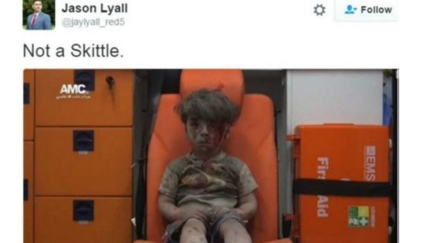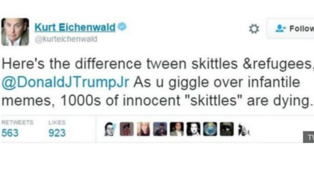 وقال المغرد كيرت ايشنولد: "ها هو الاختلاف بين (حلوى) سكيتلز واللاجئين، فبينما أنت دونالد ترامب الابن تقهقه على شعارات سخيفة، هناك آلاف من "السكيتلز" البريئة يموتون".
