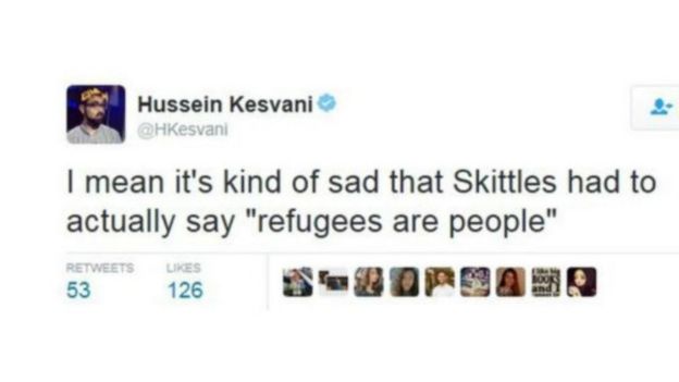 ونشر حسين كزفاني تعليقا على تويتر يؤكد فيه استياءه من وصف اللاجئين بأنه مجرد حلوى.