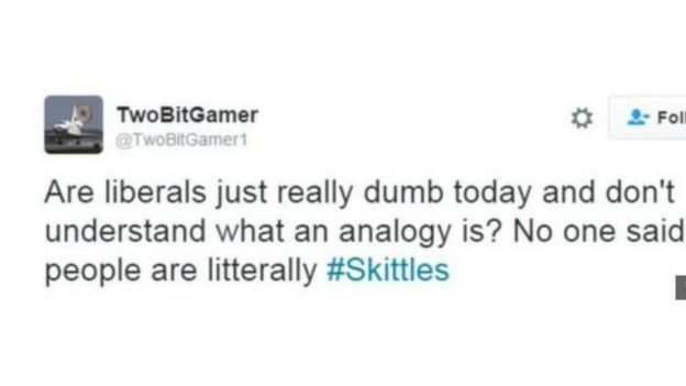 وتساءل مستخدم آخر يحمل اسم "تو بيت غايمر" في تغريدة على تويتر "هل الليبراليون مغفلون بالفعل اليوم ولا يفهمون ما هو التشبيه؟ لم يقل أحد إن الناس هم سكيتلز بالمعني الحرفي للكلمة."